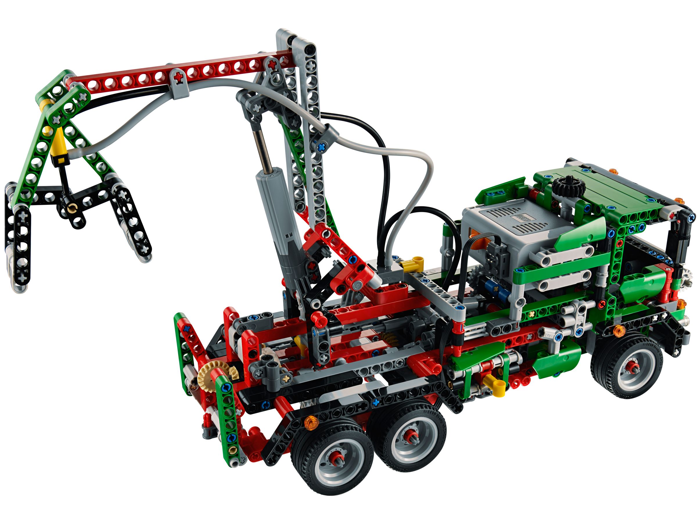 Dieser grosse, 44 cm lange Abschlepplaster bietet eine unglaubliche Fülle an Funktionen. So lassen sich die beiden vorderen Achsen von Hand steuern, wobei die beiden Achsen nicht denselben Lenkeinschlag haben, ganz wie beim grossen Vorbild. Die Hebevorrichtung kann mittels Pneumatik bzw. Power Functions bedient werden und lässt dich auch schwerste Fahrzeuge bergen! Damit der Lastwagen nicht umkippt beim Beladen, lassen sich an der Rückseite motorisiert zwei Stützen ausklappen. Die grüne Farbe des Fahrzeugs ist eher ungewohnt, passt aber gut zum Rot und Schwarz der Hebevorrichtung. Die Bauanleitung für das zweite Modell (ein Lastwagen für das Verladen von Baumstämmen auf den ebenfalls vorhandenen Anhänger) ist nicht enthalten, wird aber von der LEGO Group als Download zur Verfügung gestellt. Mit etwas Geschick und dem Remote Control Set von LEGO Technic kann man diesen Truck so umbauen, dass er sich fernsteuern lässt.