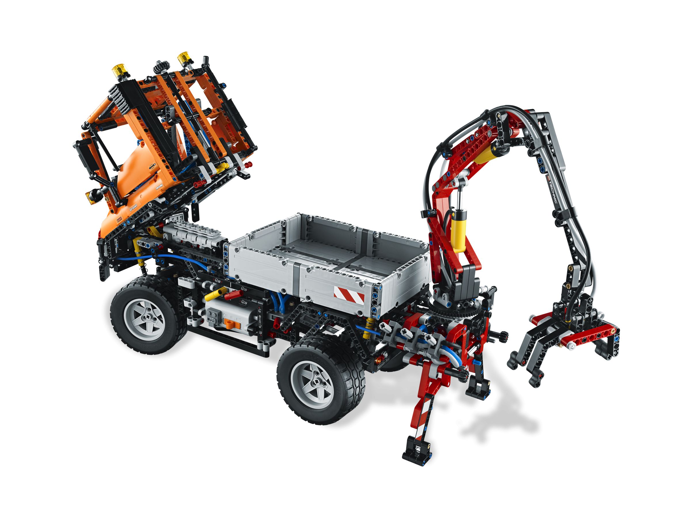 Dieser riesige Unimog U400 misst ganze 56 cm und bietet so viele Funktionen wie kein zweites Modell von LEGO Technic! Neben dem grossen Raupenbagger unserer Meinung nach das zweite Top-Modell und ebenfalls ein Muss für jeden Fan von LEGO Technic. Der Greifarm kann pneumatisch gehoben und gesenkt werden und es lassen sich Lasten greifen, ganz wie in der Realität. Im Unterschied zu anderen Modellen wird die dazu nötige Druckluft sogar mit Hilfe des Motors erzeugt (Power Functions), d.h. es muss nicht von Hand gepumpt werden. Der Aufbau mit dem Greifarm kann motorisiert um fast 360 Grad gedreht werden. Am anderen Ende des Fahrzeugs ist eine motorisierte Seilwinde angebracht, mit welcher auch schwerste Lasten bewegt werden können. Die Position von Greifarm und Seilwinde können auch vertauscht werden, so dass am vorderen Ende beladen und am hinteren Ende des Fahrzeugs gezogen wird. Die Fahrerkabine kann nach vorne gesenkt werden, wodurch der Motor mit seinen beweglichen Kolben sichtbar wird. Mit etwas Geschick und dem Remote Control Set von LEGO Technic kann man dieses geniale Fahrzeug so umbauen, dass er sich fernsteuern lässt. Zum Unimog U400 gibt es kein zweites Modell, was aber angesichts der Fülle von Funktionen und der Grösse dieses Fahrzeugs nicht weiter stört. Die Entwickler von LEGO haben hier wieder einmal ganze Arbeit geleistet!